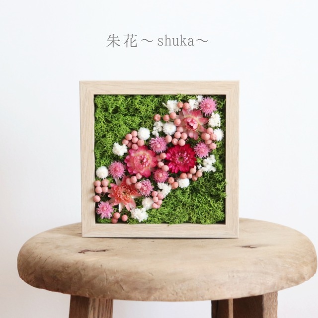 木目調のフレームに可愛らしいピンクのお花達をちりばめました。 まるでお花畑を切り取った様な可愛らしさ ドライフラワーのヘリクリサム プリザーブドフラワーのかすみそう、あじさい アーティフィシャルフラワーのグリーンなどを使い仕上げました。 お花は自然なものなので、色合いや大きさなどまちまちです。 1点物となりますので、ぜひお気に入りを見つけて下さい。 自立しますが、不安定な場所は避けて下さい。 壁掛け用の金具付きです。 サイズ フレーム 14.5×14.5×2.5㎝