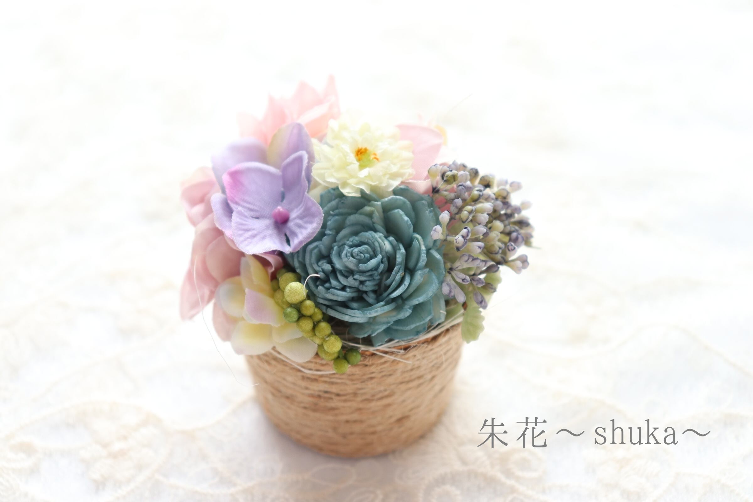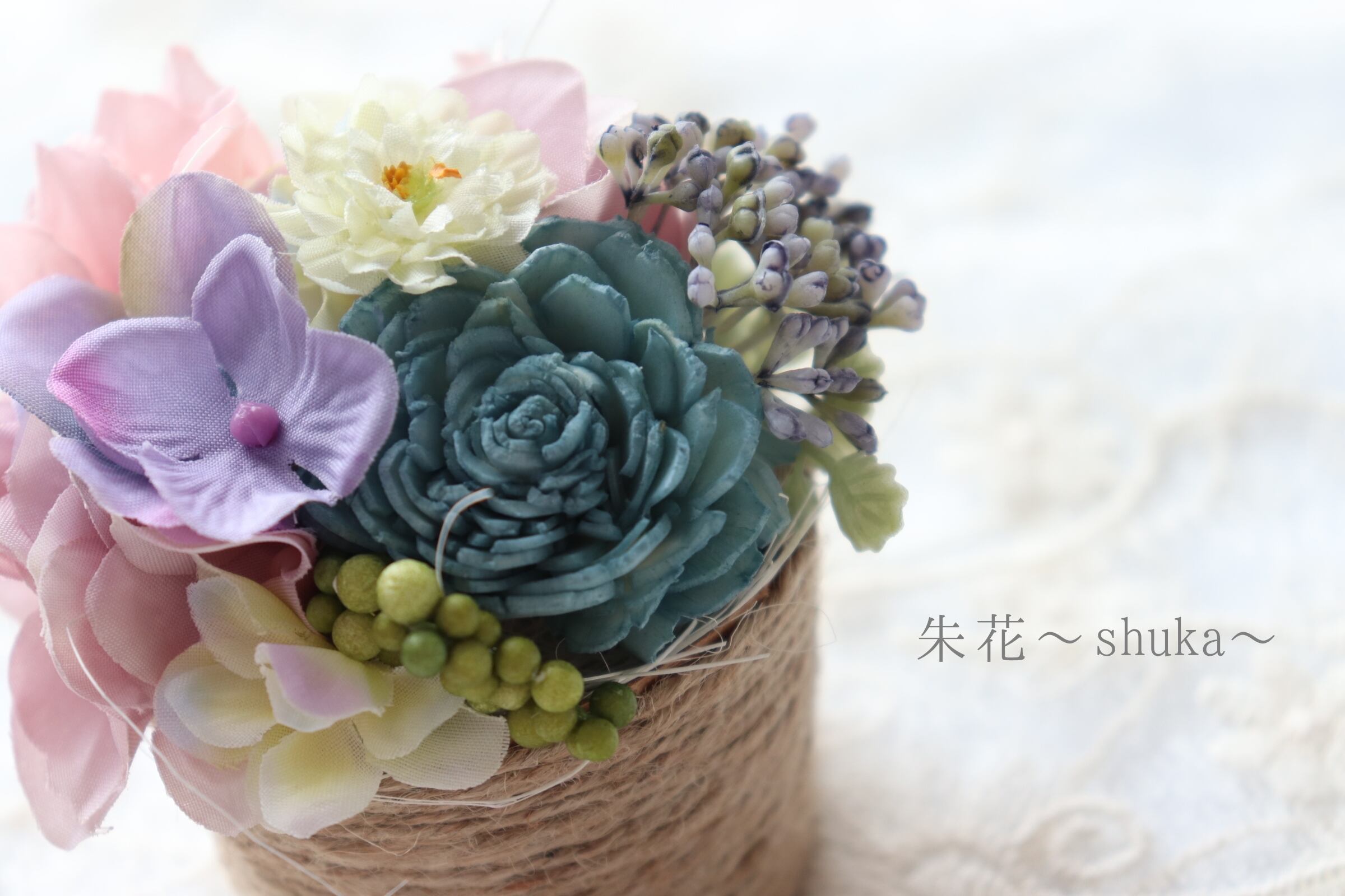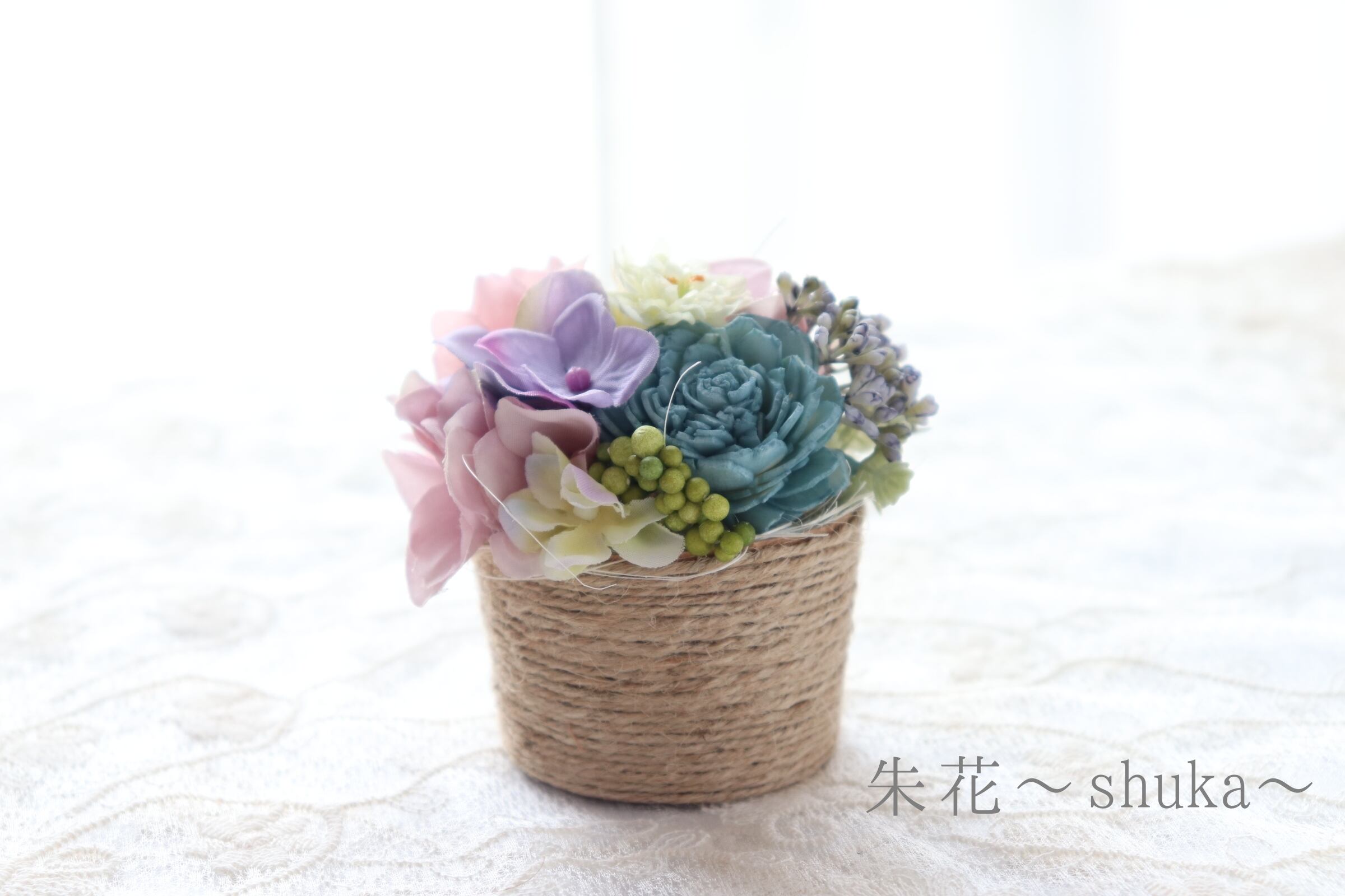 ソラフラワー(そらの木の表皮を薄くしてお花の形に加工しています)と麻のポットがナチュラルな印象のアレンジです。