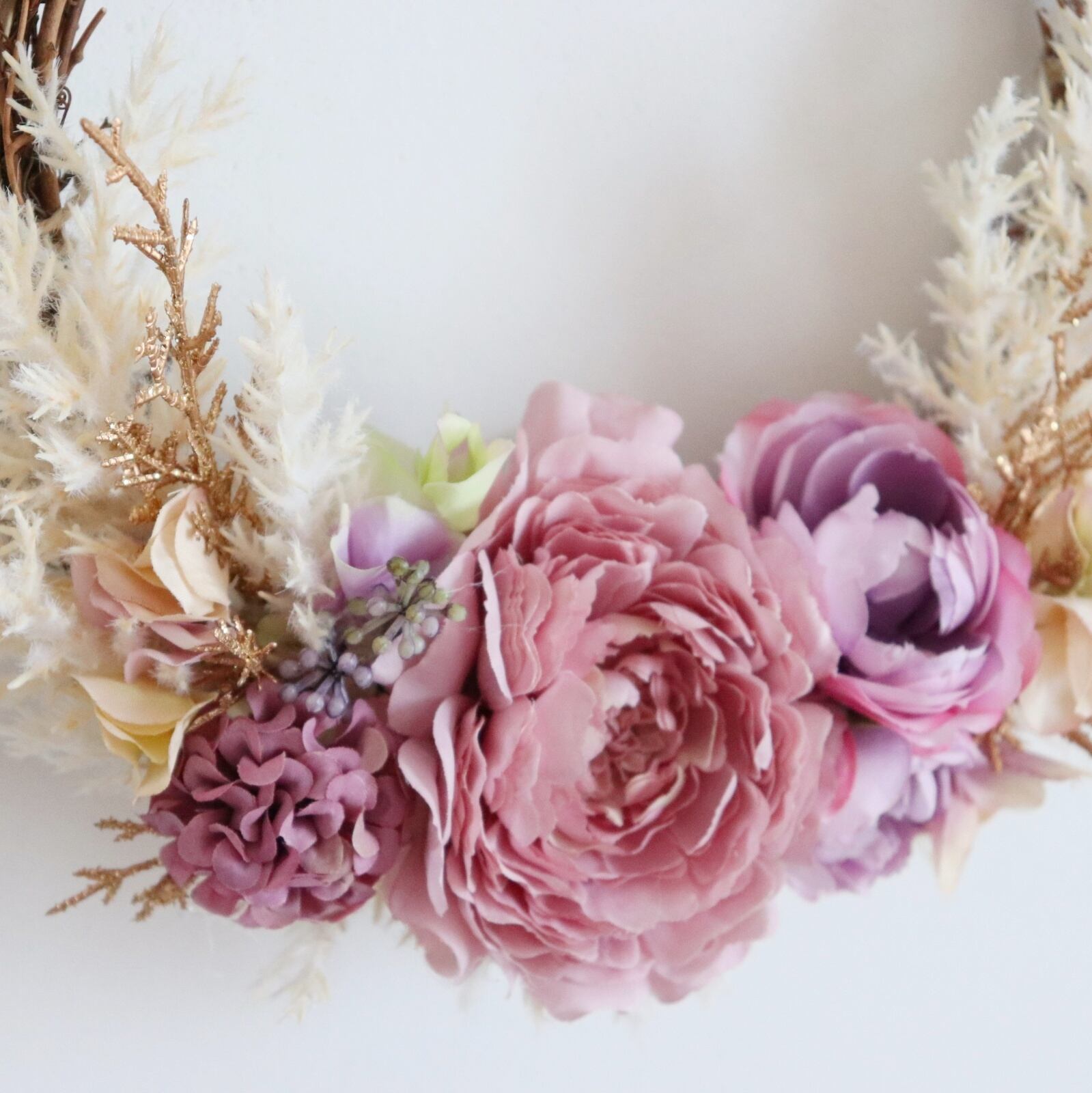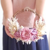 優しく落ち着いた色合いのピンクを中心に、ホワイトと合わせた大人可愛いリースです。