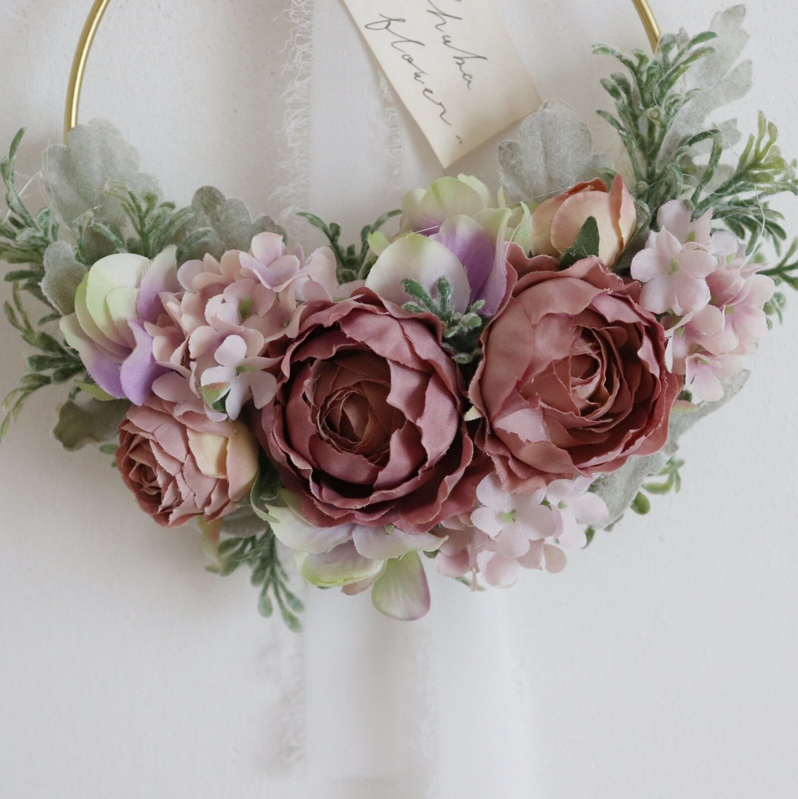 ゴールドリングにアンティークローズを合わせて、シックで女性らしいリースに仕上げました
