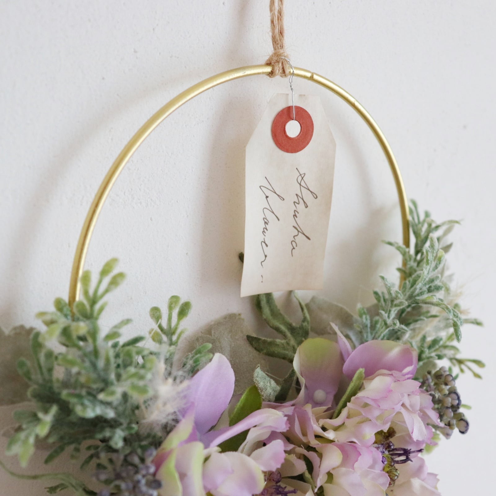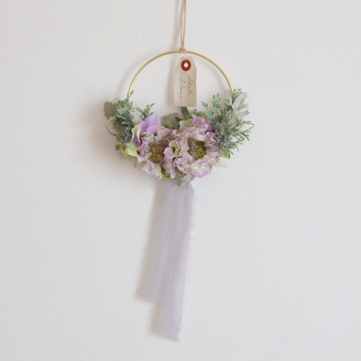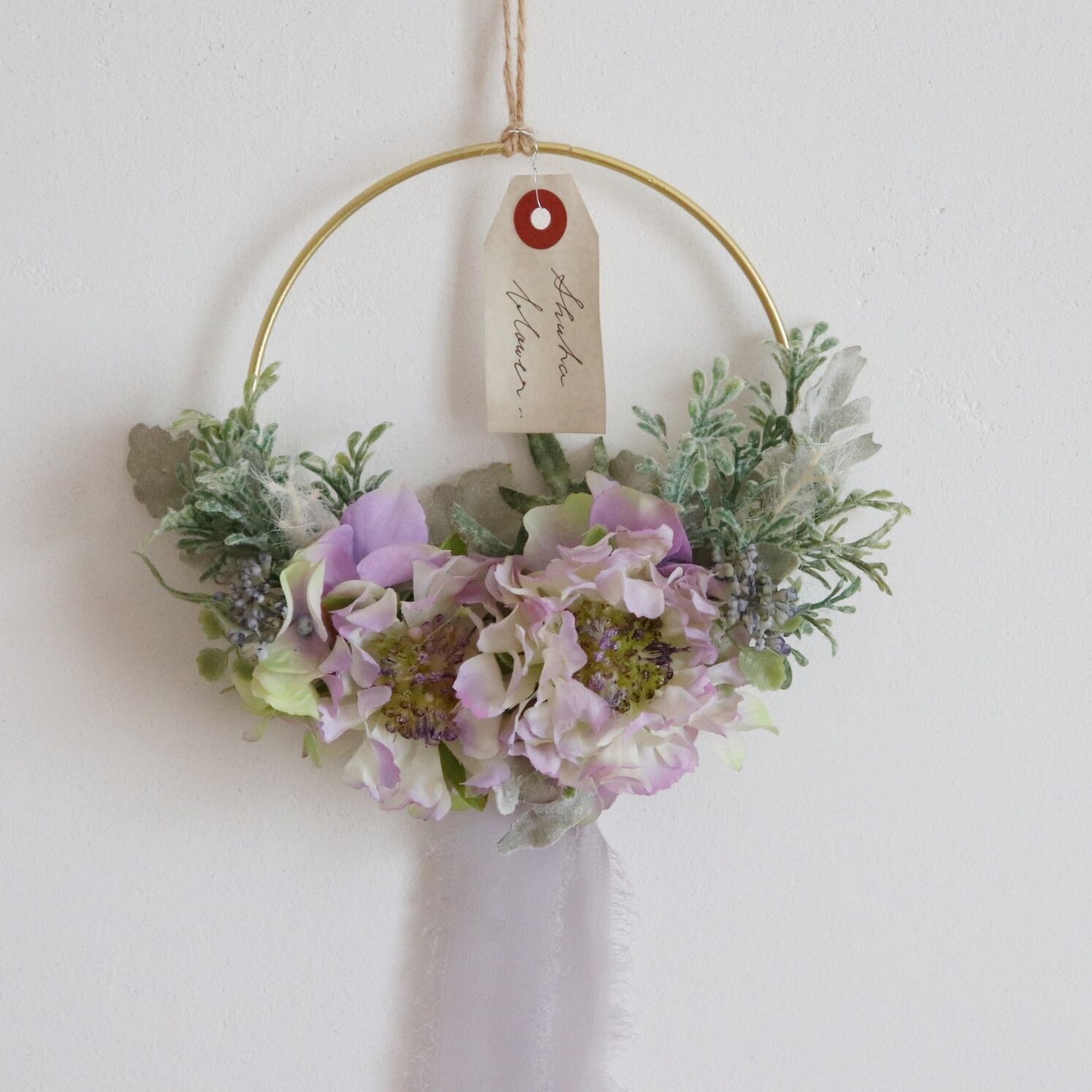 ゴールドリングにスカビオサを合わせて、シックで女性らしいリースに仕上げました