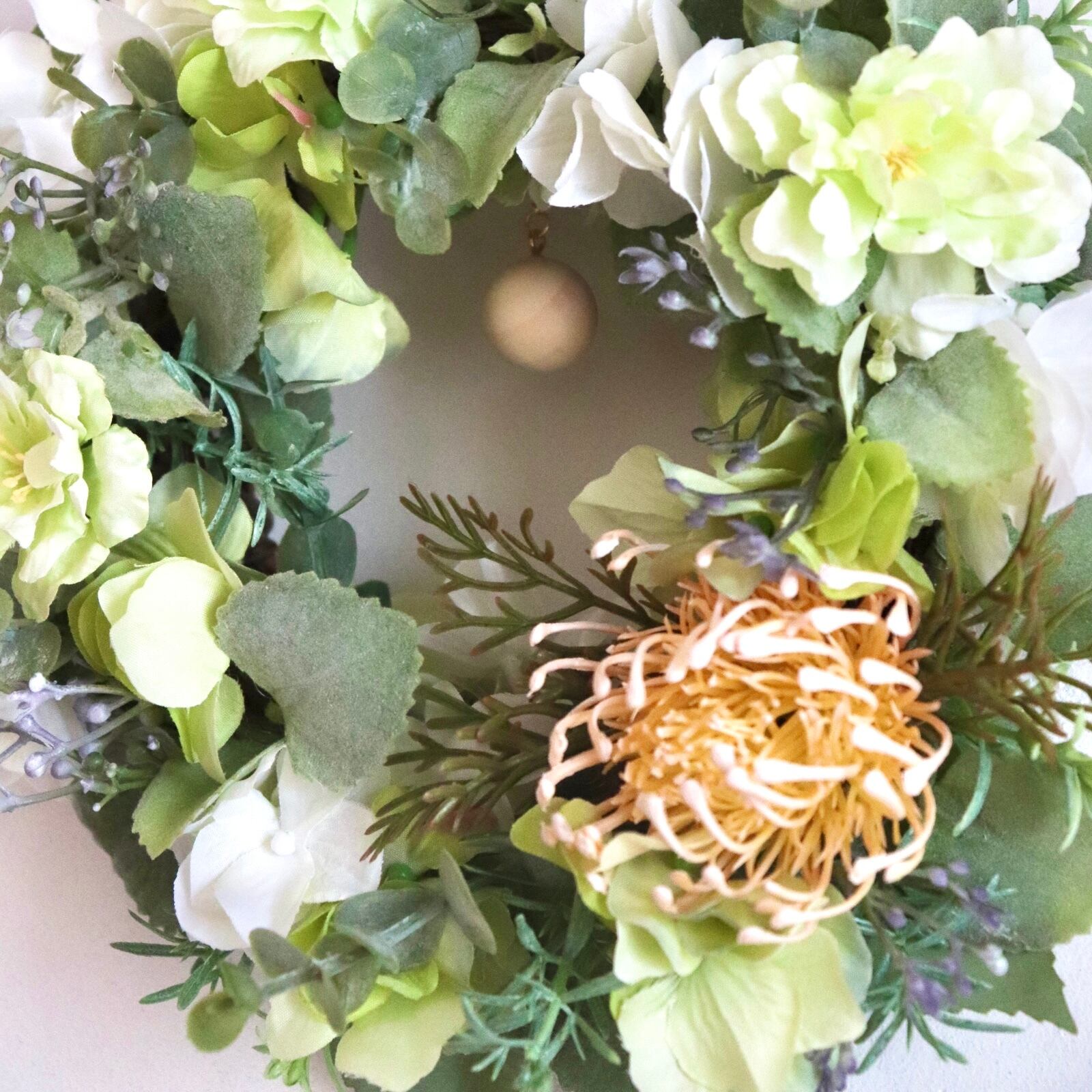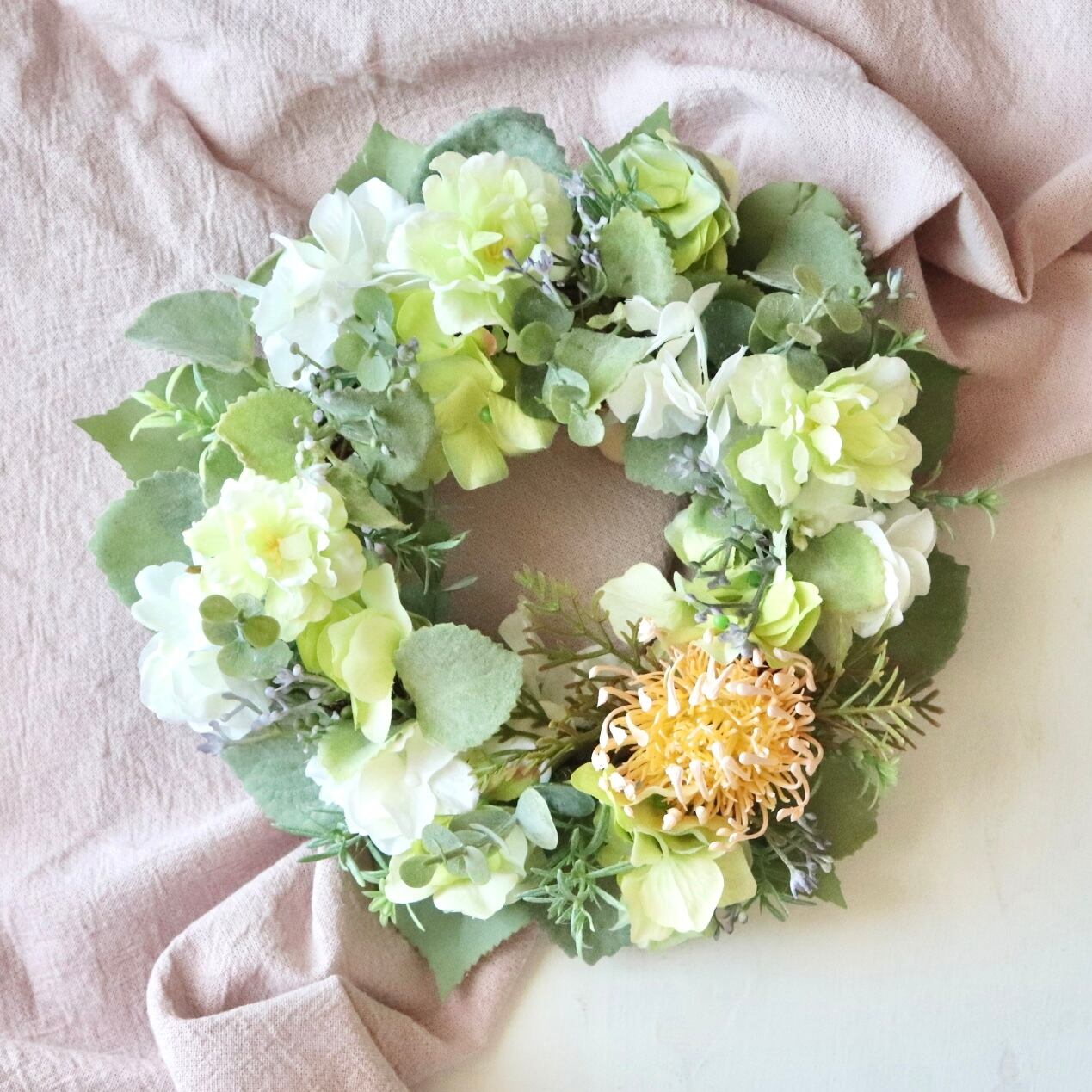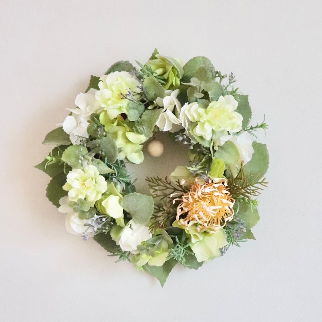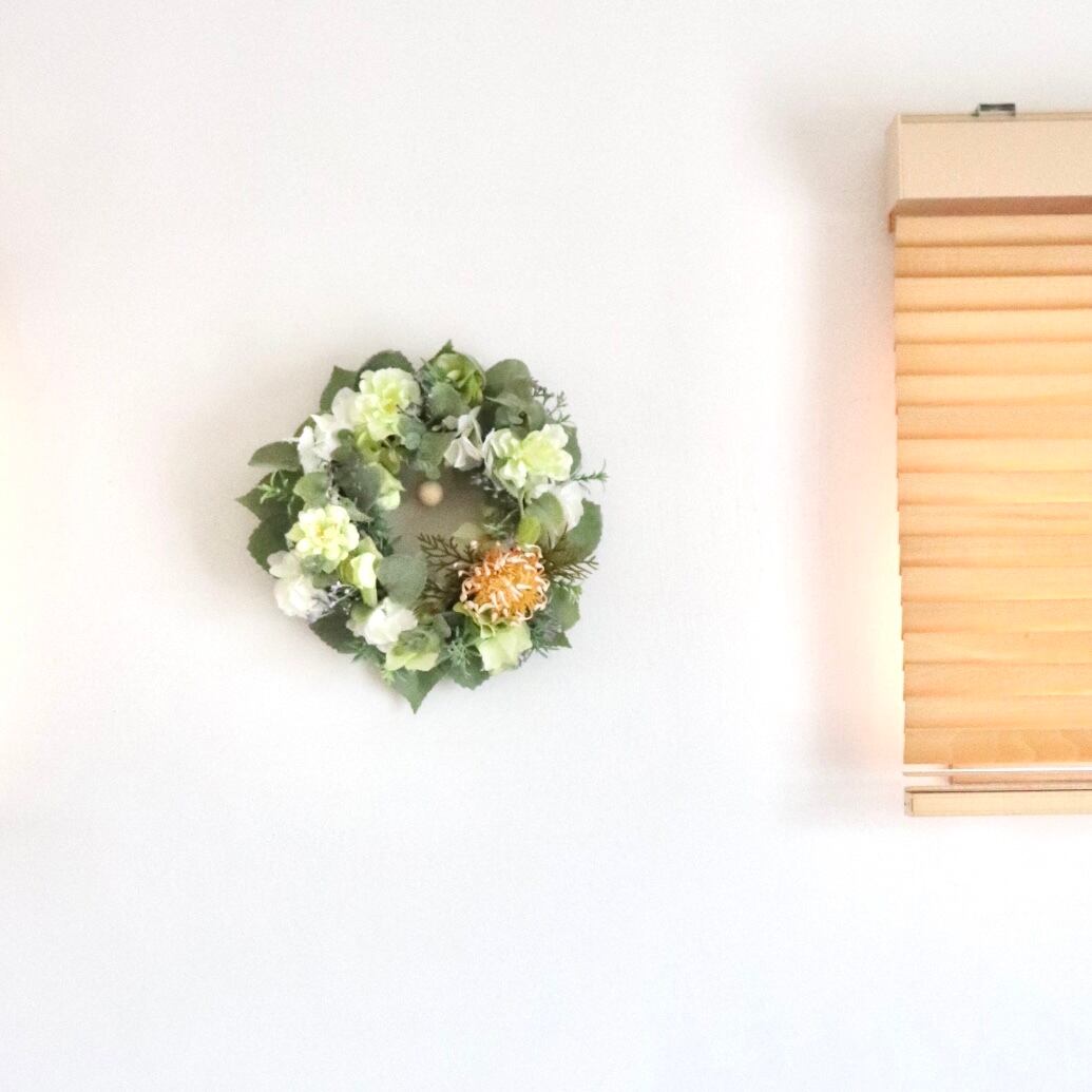 季節を問わず飾れる、ナチュラルで優しい雰囲気のリースです。