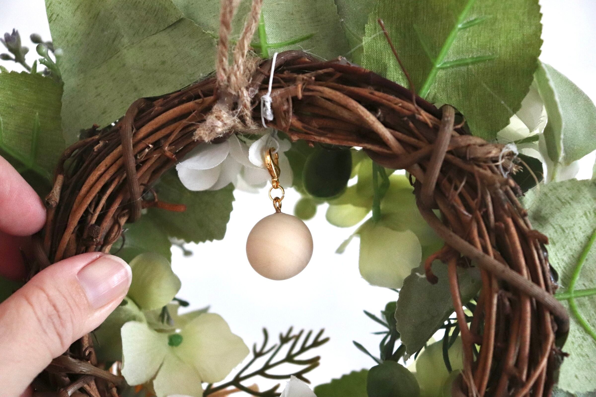 お手入れ要らずで丈夫な、アーティフィシャルフラワーのハーブリースに、アロマの香りをプラスできるチャームを付けました。