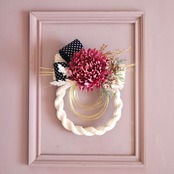 新年を迎えるのに最適な、清らかな白色のしめ飾りです。ネイビー×白の水玉模様のリボンで清楚な印象に。特別な日の雰囲気を引き立てます。