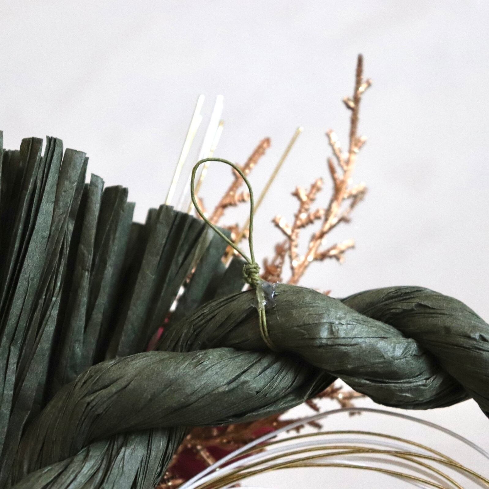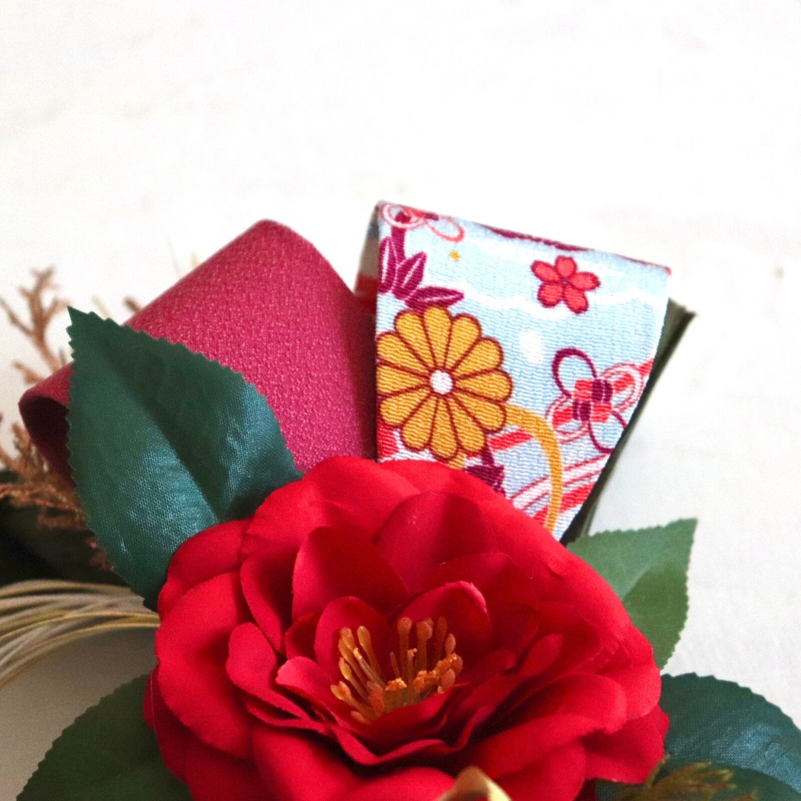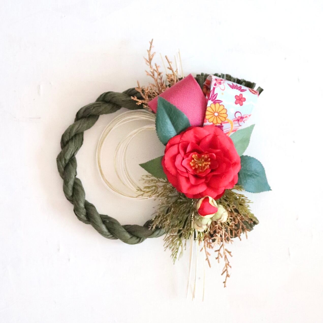 新年を迎えるのにぴったりな、和風のリボンをあしらったしめ飾りです。伝統的なデザインに現代的なセンスを加えた素敵なアイテムが、特別な日の雰囲気を引き立てます。